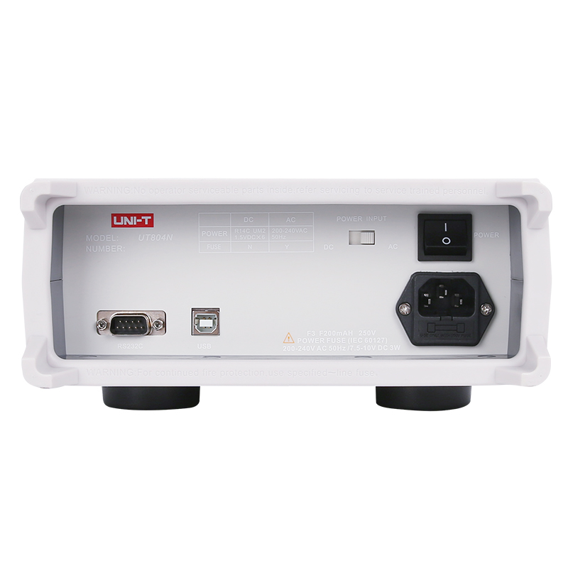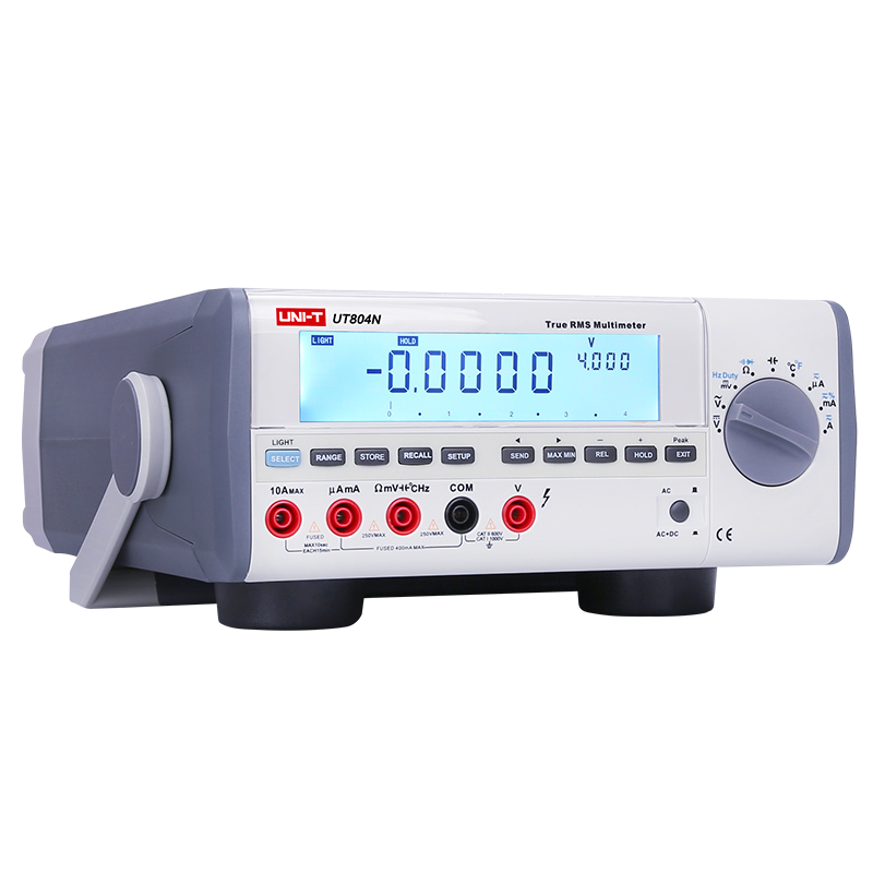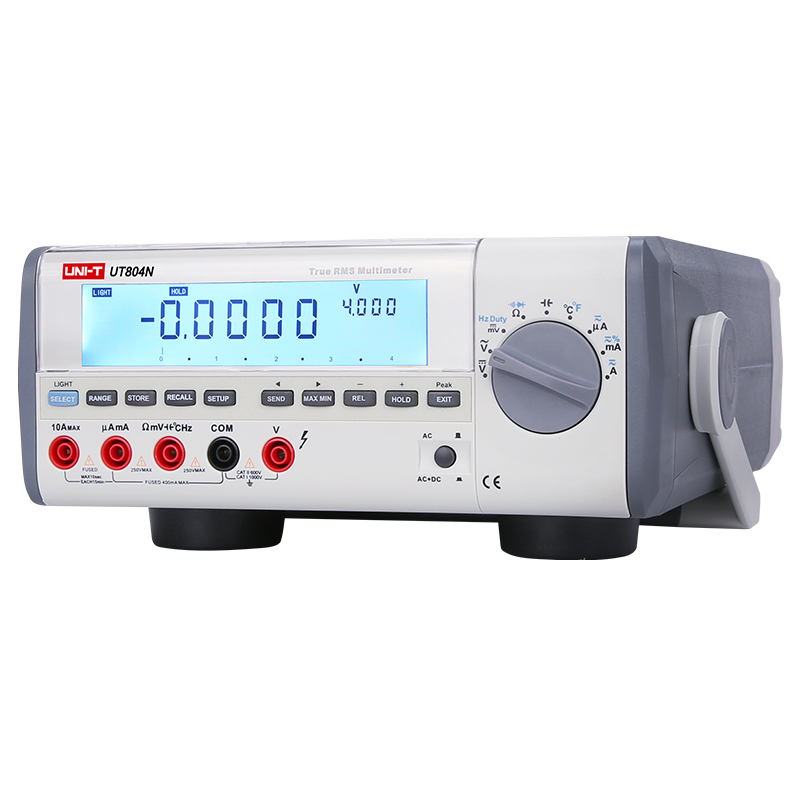 UT804N是40000計數4 3/4數位,自動量程真有效值數字臺式機。具有全功能模擬條圖顯示,全量程過載保護,電池、市電雙供電模式。可用于測量真有效值交流或(AC+DC)電壓和電流、直流電壓和電流、電阻、二極管、電路通斷、電容、頻率、占空比、溫度、峰值保持、大/小值、相對測量等參數。并具有白色背光、用戶設置、RS232和USB數據傳輸、9999條數據存儲、數據保持和電池供電狀態下欠壓顯示和自動關機等功能。