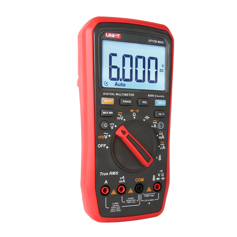 UT15B MAX/UT17B MAX/UT18B MAX是高可靠性真有效值(True RMS)數字萬用表,產品內置VFD抗干擾啟動 模式,能過濾正弦波疊加的載頻干擾或各種畸變電壓信號,穩定測量變頻器的輸出電壓。可在DC/AC功能下切換 進入頻率及占空比測量。UT17B MAX/UT18B MAX配置了0.1°C分率溫度測量功能。UT18B MAX擁有的LED測量功能最 高可測12V LED,且不用區分正負極性。該系列產品全功能實現高達30kVA能量的誤測保護、電流檔誤插輸入孔 報警,確保用戶操作上更安全更放心; 產品根據CAT III 600V安全等級取得CE、cETLus認證。