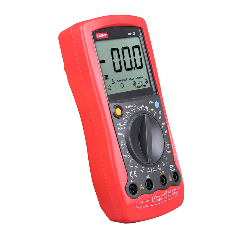 UT105儀表是1999計數的手動量程汽車數字多用表。具有特大屏幕、全功能符號顯示及輸入連接提示、全量程過載保護和獨特的外觀設計、使之成為性能更優越使用更安全的電工儀表。本儀表可用于測量:交直流電壓、直流電流、電阻、二極管、電路通斷及汽車的轉速和閉合角。