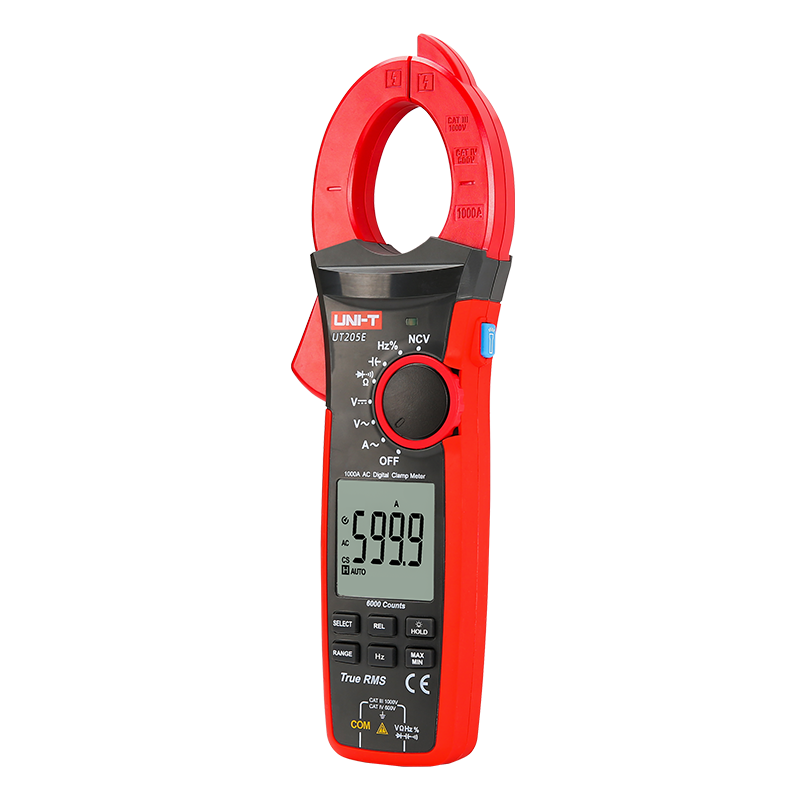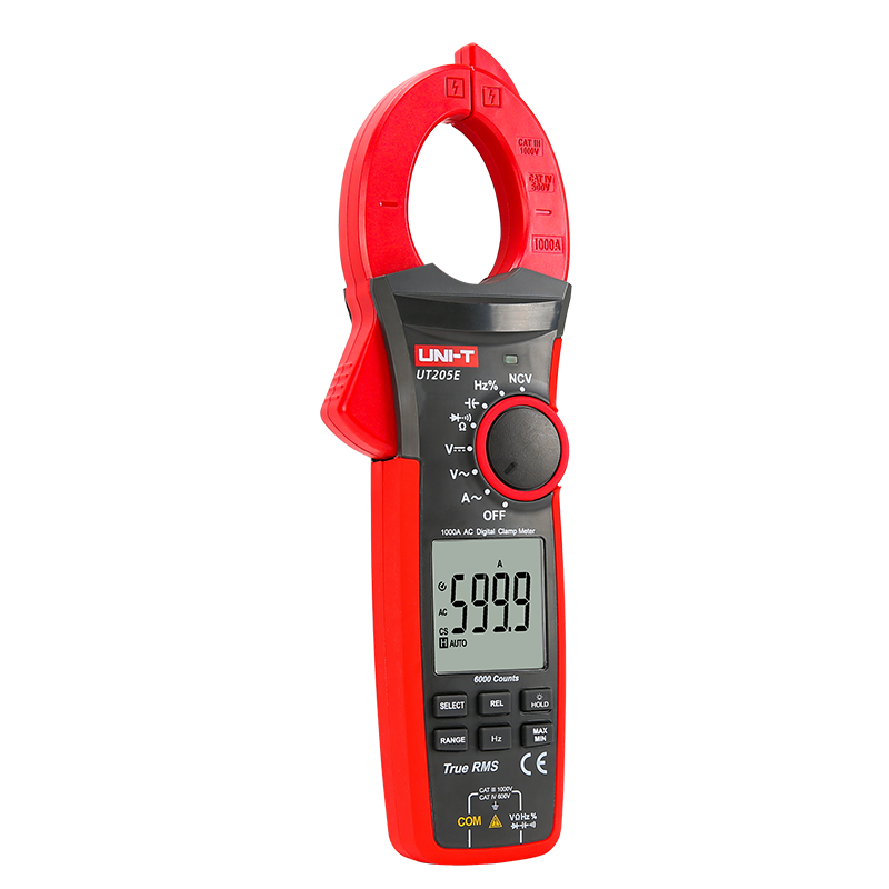 UT205E 真有效值數字鉗形表是6000顯示位數,自動量程便攜手持式,整機電路設計以大規模集成電路Σ/Δ模數轉換器為核心,全量程過載保護電路,獨特的外觀設計使之成為性能優越的電子電工專用儀表。可用于測量交直流電壓、交流電流、電阻、二極管、電路通斷、電容、頻率、占空比等測量功能,并具有數據保持、最大/最小值測量、相對值測量手電筒功能、NCV功能、欠壓顯示和自動關機功能。