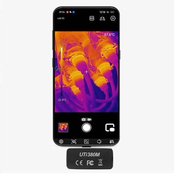UTi380M 紅外熱成像儀手機模組,可以配合手機進行紅外熱成像測溫,體型小巧便攜,操作簡單。400×300像素,讓您擁有細膩畫質體驗。手動調焦和2x超分功能,使在優秀的成像基礎上更能看得清細節。25Hz幀頻,流暢視頻不卡頓,讓你能快速便捷的發現隱藏問題。-20 ~550℃ 的寬廣量程,覆蓋廣泛應用、還可通過手機APP實現實時測溫,夜視、拍照、錄像等功能,是你日常工作,家居生活,探險旅行的全能助手。