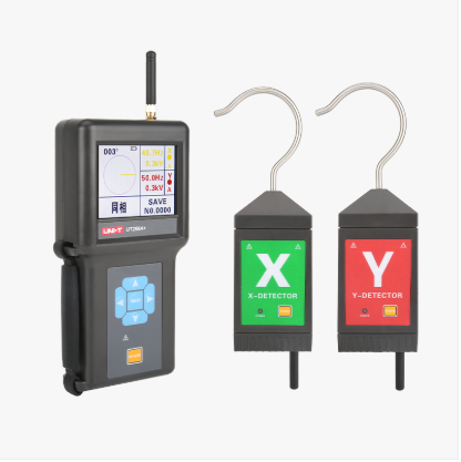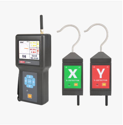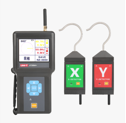UT269A+無線高壓核相儀是專為高壓線路及高壓開關柜(中置柜、環網柜等)核相而精心設計制造的,儀表突破傳統核相器電壓等級限制問題,可以在極低電壓線路中核相,完全實現從 10V~500kV 電壓自動核相,無需根據電壓等級購置多套核相儀,節省成本,減少攜帶,省時快捷。本核相儀無線傳輸距離遠,核相距離達 200 米(在空曠場地)。本核相儀還具有測試相位、頻率、相序、變壓器組別判斷等功能,還有驗電及電壓等級顯示功能。當線路電壓超過 110kV,必須使用非接觸核相,核相時將探測器的金屬探鉤逐漸靠近導線,當感應到電場信號即可完成核相,無需直接接觸高壓導線,安全快速。用于環網柜核相時,探測器必須使用探針及環網柜測試線。